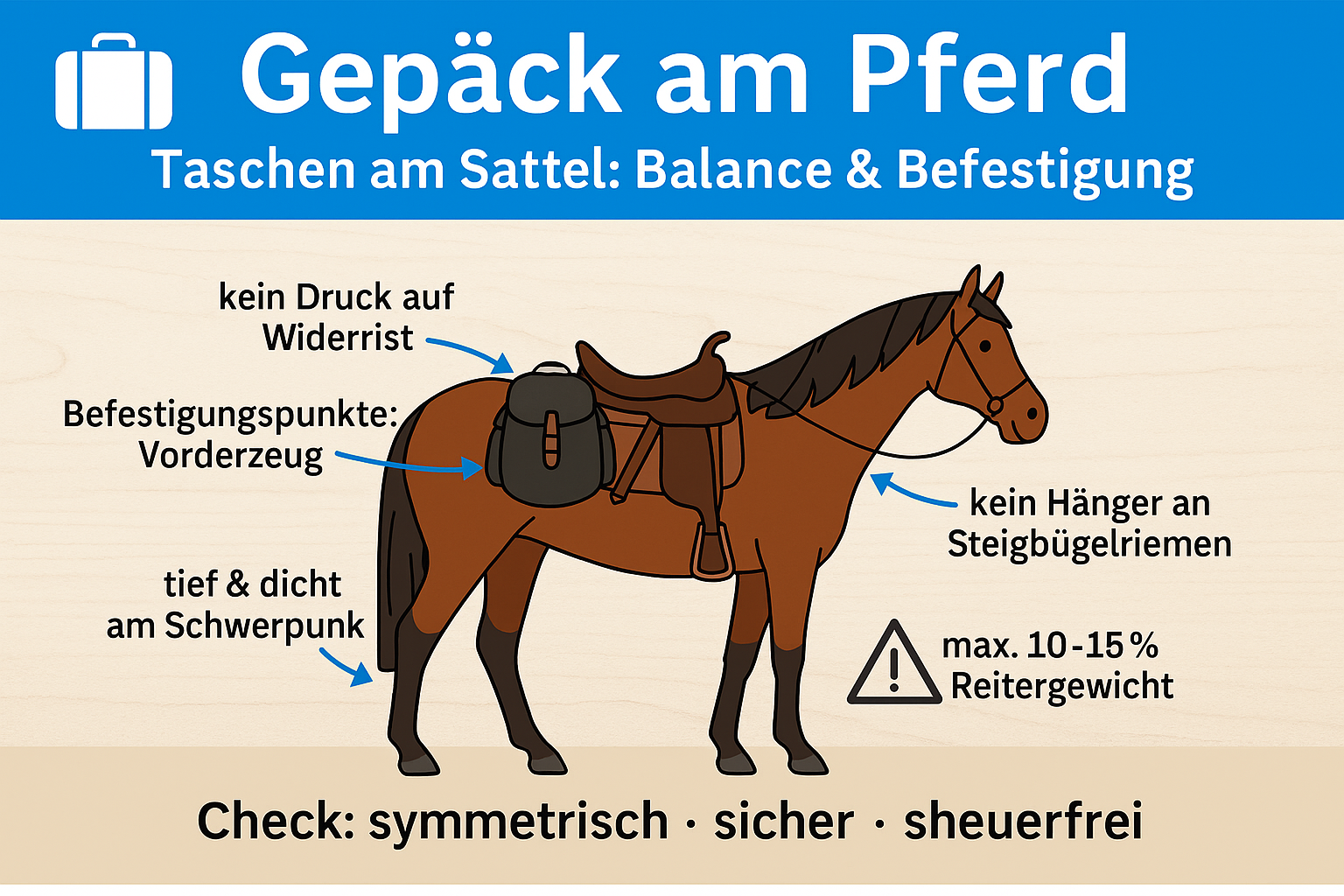 Jedes Kilo, das du an den Sattel hängst, verändert die Last auf dem Rücken deines Pferdes. Solange das Gepäck symmetrisch und nah am Schwerpunkt verteilt ist, kann dein Pferd damit gut umgehen. Wird es aber einseitig, zu hoch oder zu weit hinten, kommt es zu: