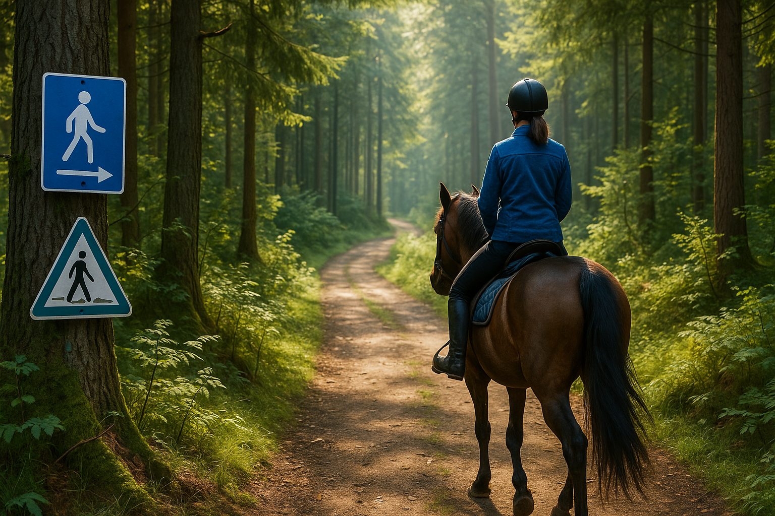 • Wege nutzen & Wegequalität beachten: Reiten nur auf Straßen/Wege, je nach Land teils nur auf ausgewiesenen Reitwegen oder „geeigneten“/„festen“ Wegen erlaubt.