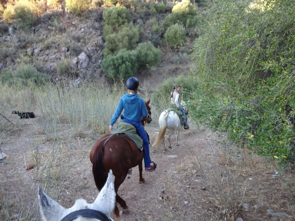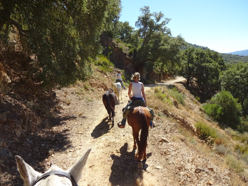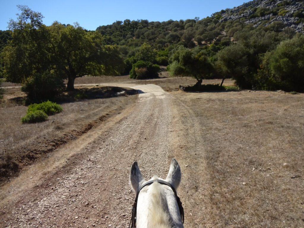 Leider ließ der steinige und teilweise auch recht steile Boden keinen Galopp zu, so dass wir den ganzen Tag nur im Schritt unterwegs waren. (Die Gangart Trab wird in Andalusien nicht geritten). Die Sierra de Grazalema ist eine Gebirgskette mit einer Höhe von bis zu 1.654 m zu der auch das Bergland von Ronda gehört, in dem wir unsere Tour gestartet haben.
