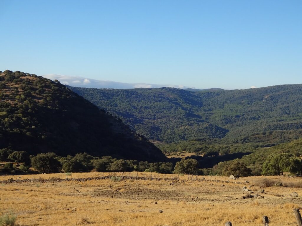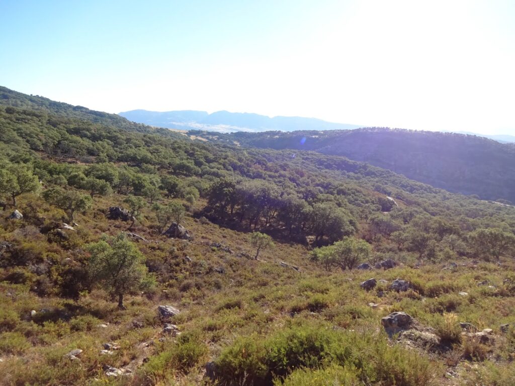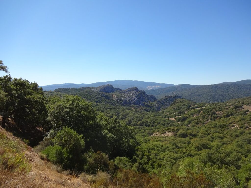 Hinter Cortes tauchten wir ein in den Naturpark Sierra de Grazalema und Los Alcornocales, benannt nach der allgegenwärtigen Korkeiche („Alcornoque“). Mit rund 167.000 Hektar Fläche ist Los Alcornocales das größte zusammenhängende Korkeichengebiet der Iberischen Halbinsel. Und dementsprechend haben wir in den verbleibenden 7 1/2 Stunden ab jetzt auch nichts außer Korkeichen um uns herum gesehen. Trotzdem war die Landschaft sehr reizvoll, denn durch die hohen Berge rundherum und den Pass den wir überquert haben, war die Aussicht immer mal wieder eine andere und größten Teils sehr, sehr schön.