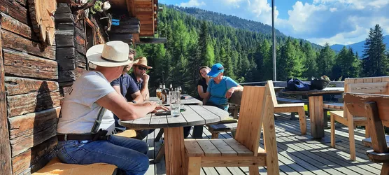 Auf etwa 1.839 Metern erreichen wir die Gruberalm. Hier legen wir eine wohlverdiente Pause ein. Die Pferde bekommen Wasser und eine kleine Stärkung, wir selbst lassen uns ein kühles Radler schmecken und genießen den Blick über das Ahrntal.