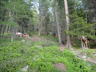 Wir steigen in ruhigem Tempo auf, legen kurze Pausen ein und lassen die Pferde zwischendurch grasen. Mit jedem Höhenmeter wird der Blick zurück ins Tal eindrucksvoller – man sieht die Linien der Wege, die kleinen Ortschaften, die sich an den Fluss schmiegen, und die Berge, die sich dahinter auftürmen.