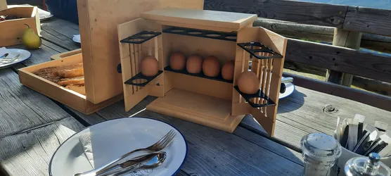 Schließlich erreichen wir den Obersteinerhof im Schauinstal, nahe der Schneida Olm. Hier werden die Pferde untergebracht, wir richten unser Nachtlager im Heuboden her und freuen uns auf ein Abendessen mit Blick ins Tal.